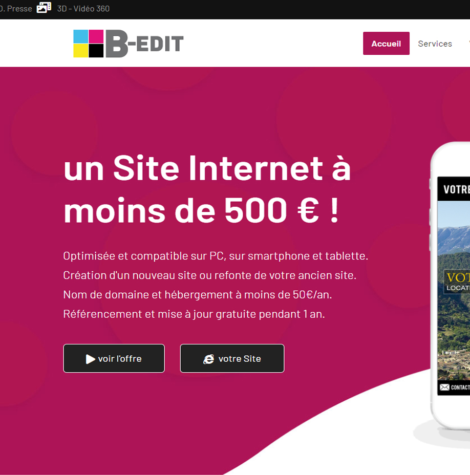 Optimisée et compatible sur PC, sur smartphone et tablette. Création d'un nouveau site ou refonte de votre ancien site. Nom de domaine et hébergement à moins de 50€/an. Référencement et mise à jour gratuite pendant 1 an.